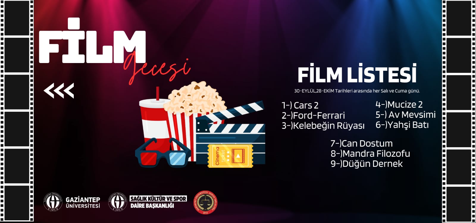 Film Gecesi Başlıyor! 30 Eylül – 28 Ekim tarihleri arasında her Salı ve Cuma günü saat 19.00’da keyifli film gösterimlerimize davetlisiniz! Gaziantep Üniversitesi Genç Ofis (Hukuk Cafe)